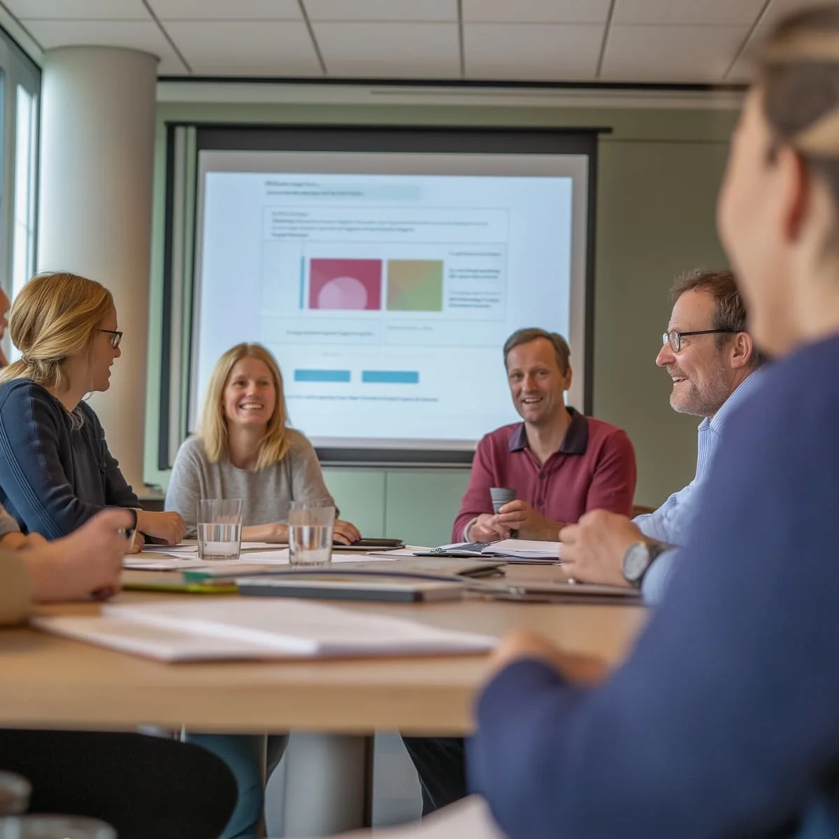 A group of people in a business meeting around a conference table, with a presentation displayed on a screen in the background.